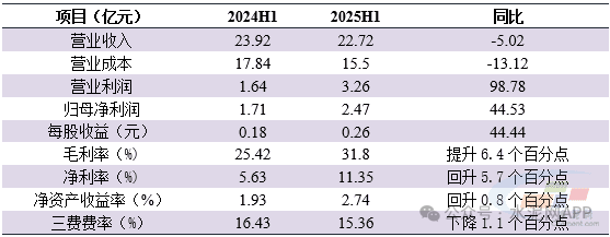 综评:2025年上半年,上峰水泥实现营业收入22.72亿元,同比下降5.02%;归母净利润2.47亿元,同比增长44.53%。今年上半年,上峰水泥持续推进“一主两翼”发展战略,水泥建材主业盈利能力保持行业领先地位,新经济股权投资业务继续扩大,持续贡献正向投资收益。