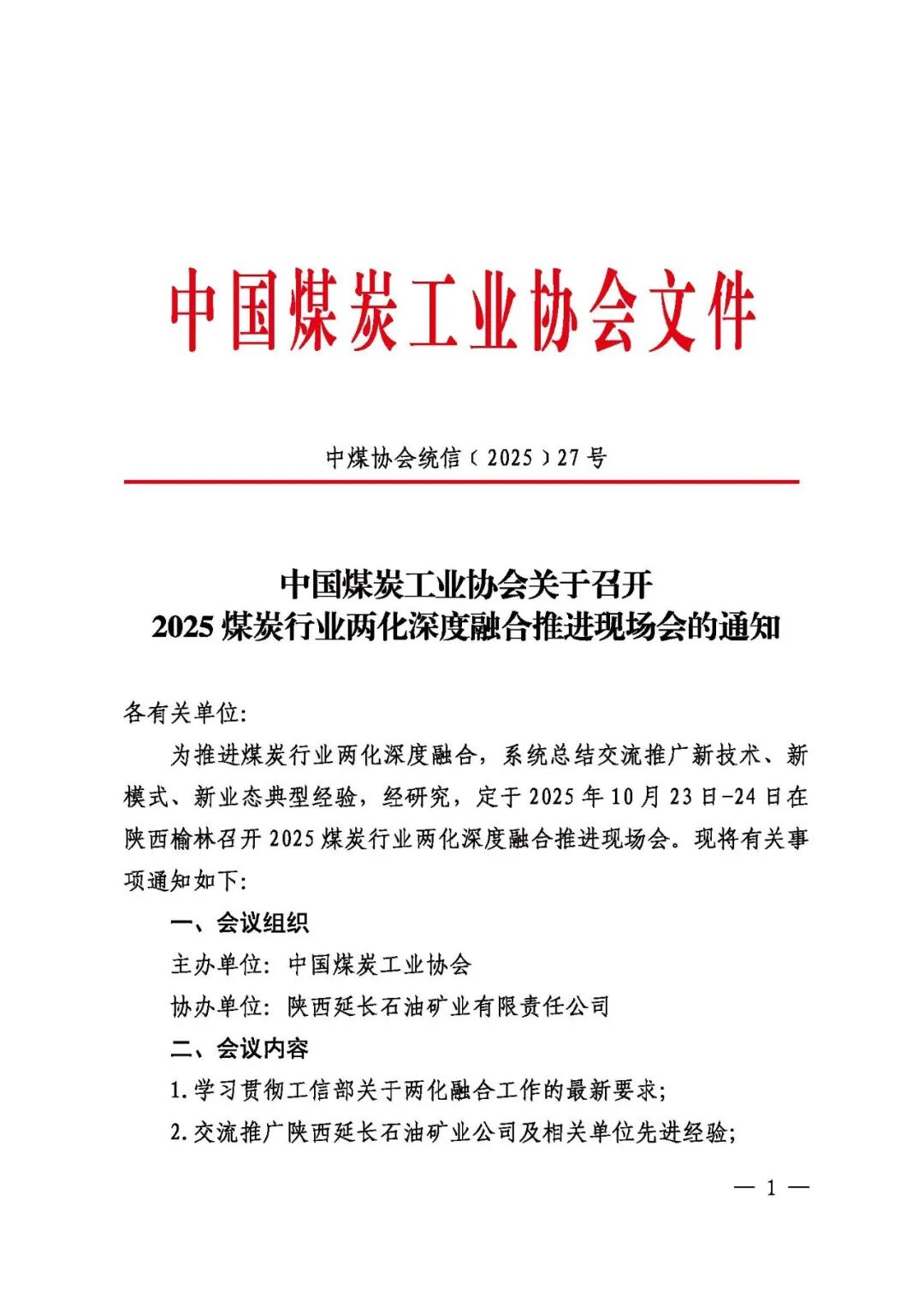 中国煤炭工业协会关于召开2025煤炭行业两化深度融合推进现场会的通知