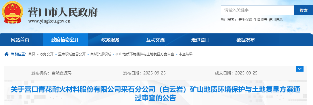 根据《国土资源部办公厅关于做好矿山地质环境保护与土地复垦方案编报有关工作的通知》(国土资规〔2016〕21号)和《转发国土资源部办公厅关于做好矿山地质环境保护与土地复垦方案编报有关工作的通知》(辽国土资办发〔2017〕88号)有关要求,营口青花耐火材料股份有限公司采石分公司(白云岩)矿山地质环境保护与土地复垦方案通过审查,现予公告。
