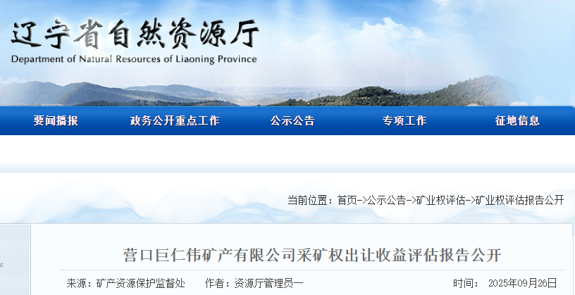 按照《关于完善矿业权出让收益评估程序的通知》(辽自然资办发[2022]2号)要求,《营口巨仁伟矿产有限公司采矿权出让收益评估报告》及相关附件已在省自然资源厅公示10个工作日,无异议,予以公开。