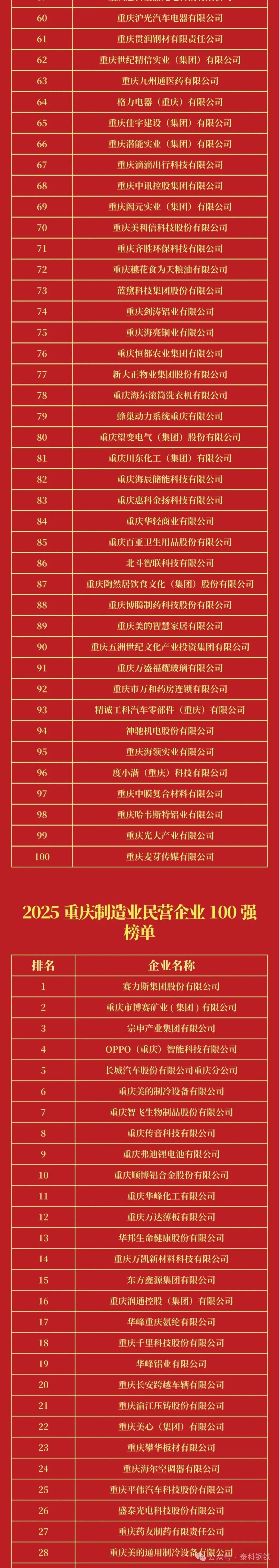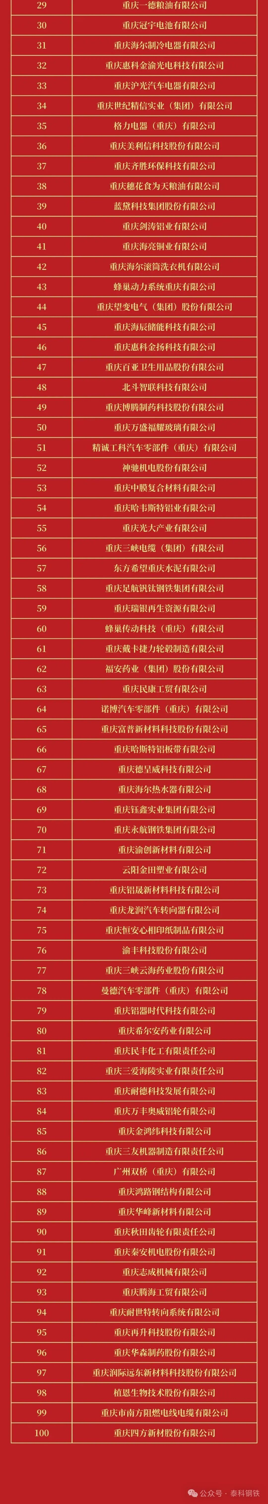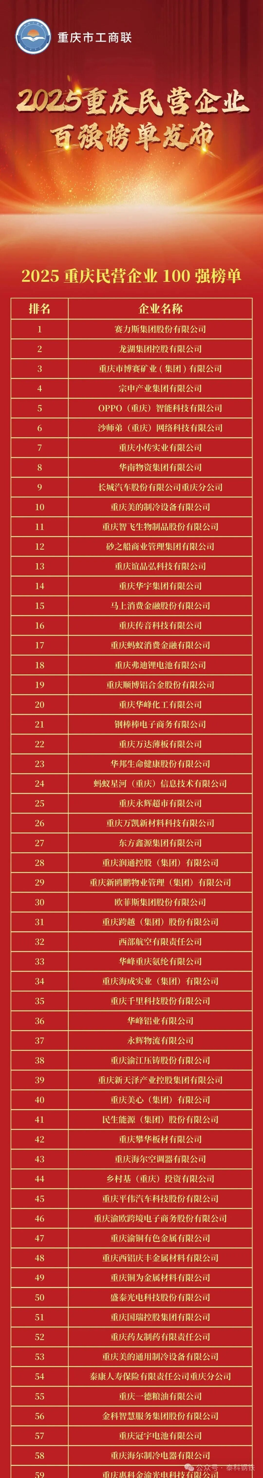 9月19日,重庆市工商联、市发改委、市经信委举办“2025重庆民营企业100强发布会”会上,2025重庆民营企业100强和2025重庆制造业民营企业100强榜单正式发布。钢铁、冶金行业,赛博矿业、万达薄板、攀华板材等上榜民营企业100强,足航钒钛钢铁、永航钢铁集团等上榜制造业民营企业100。
