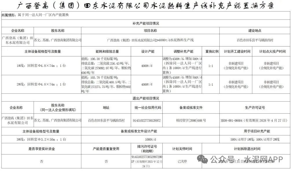 方案显示,广西登高(集团)田东水泥1#、2#4000t/d生产线各补充产能500t/d,退出产能来自同公司3#1000生产线,置换比例1:1。