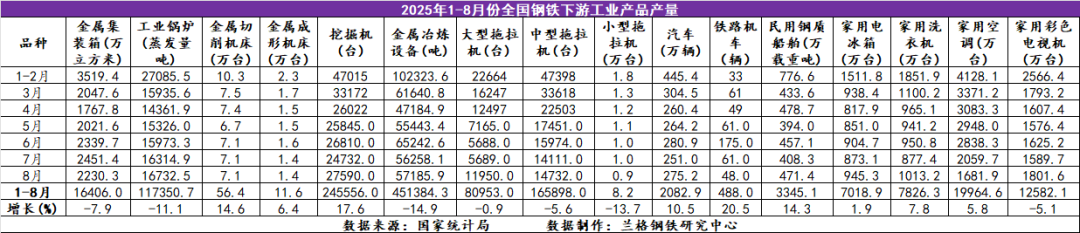 表2 2025年1-8月全国钢铁下游工业产品产量
