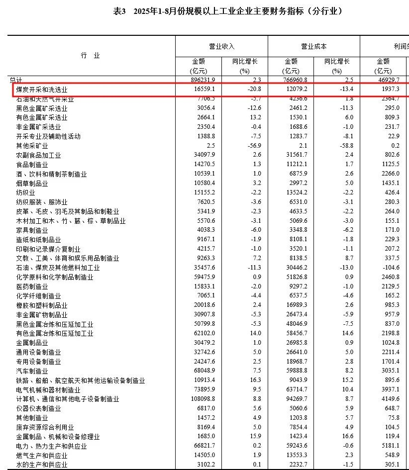 1—8月份,煤炭开采和洗选业利润总额1937.3亿元,同比下降53.6%。