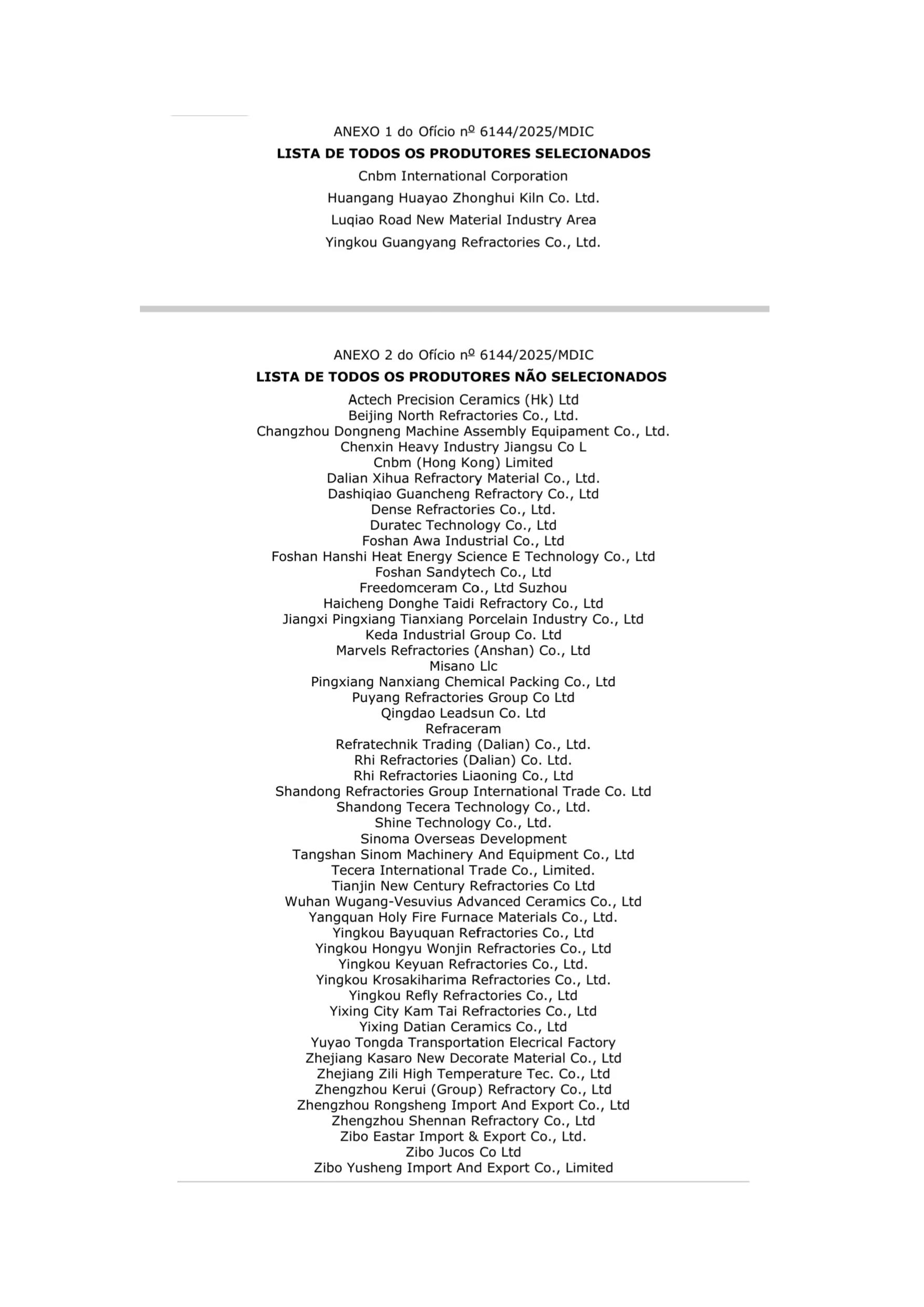 附件:耐火材料反倾销案巴西调查机关抽样名单