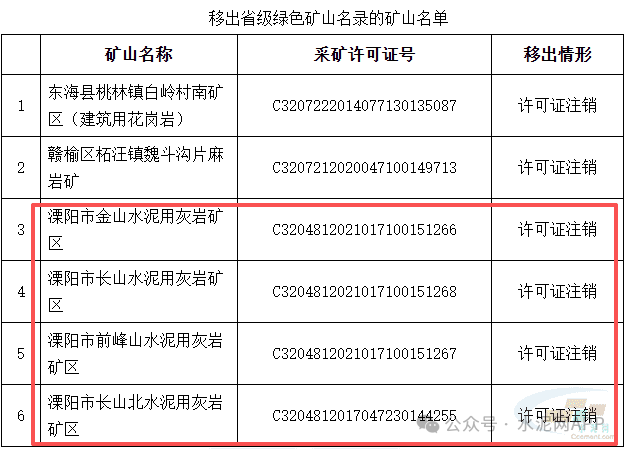 近日,江苏省自然资源厅发布关于将赣榆区柘汪镇魏斗沟片麻岩矿等6家矿山移出省级绿色矿山名录的公告,其中包含4家水泥用矿山。