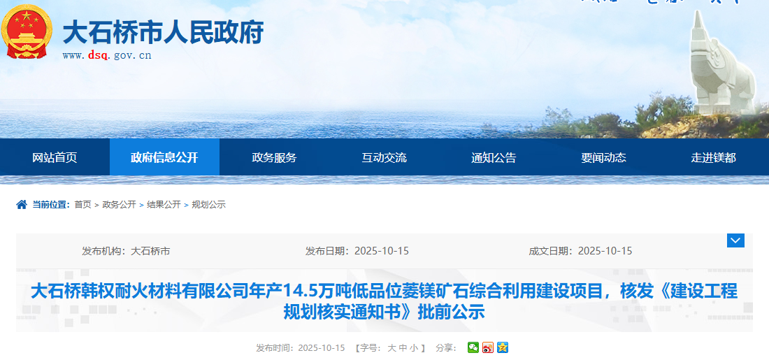 大石桥韩权耐火材料有限公司年产14.5万吨低品位菱镁矿石综合利用建设项目,核发《建设工程规划核实通知书》批前公示