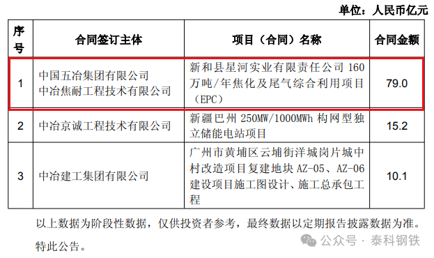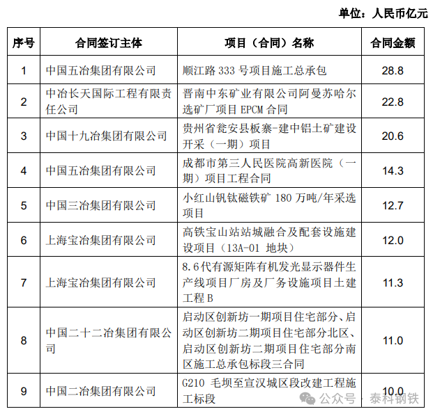 冶金领域,2025年9月,上海宝冶集团有限公司新签山东众鑫冶金材料有限公司冷轧涂镀项目建安总承包工程合同,合同金额23亿元;上海宝冶集团有限公司新签山东钢铁集团永锋临港有限公司临港先进优特钢产业基地二期(二步)项目建安总承包工程合同,合同金额11.8亿元;此外,上海宝冶集团有限公司签约山西通才工贸有限公司年产100万吨能源新材料精品钢管生产线建设项目EPC总承包工程合同 ,合同金额11.8亿元;中国五冶集团有限公司、中冶焦耐工程技术有限公司签新和县星河实业有限责任公司160万吨/年焦化及尾气综合利用项目(EPC),合同金额79亿元。中国一冶集团有限公司、中冶建筑研究总院有限公司签约三门峡高新区铜基新材料产业园EPC总承包项目,合同额18.3亿元。中冶焦耐工程技术有限公司签约哈萨克斯坦 Qarmet No.8&9 焦化项目供货合同,合同金额12.7亿元。