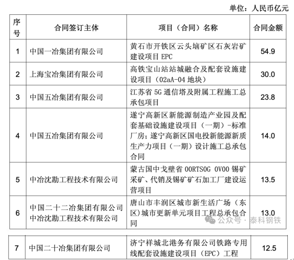 中国中冶7月新签单笔合同额在人民币10亿元以上的重大工程承包合同项目: