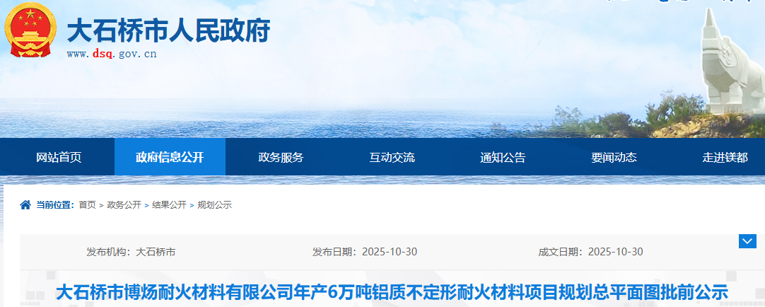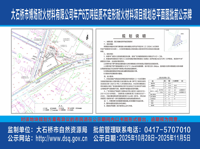 大石桥市博炀耐火材料有限公司年产6万吨铝质不定形耐火材料项目规划总平面图批前公示