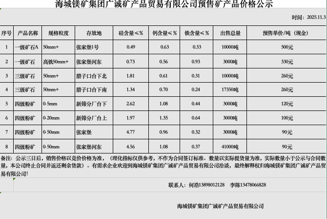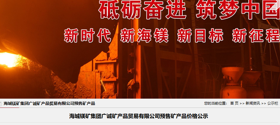海城镁矿集团广诚矿产品贸易有限公司预售矿产品价格公示