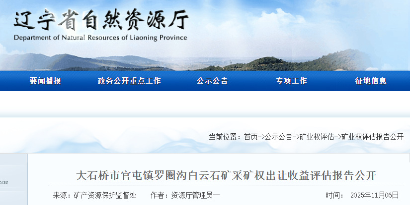 按照《关于完善矿业权出让收益评估程序的通知》(辽自然资办发[2022]2号)要求,《大石桥市官屯镇罗圈沟白云石矿采矿权出让收益评估报告》及相关附件已在省自然资源厅公示10个工作日,无异议,予以公开。