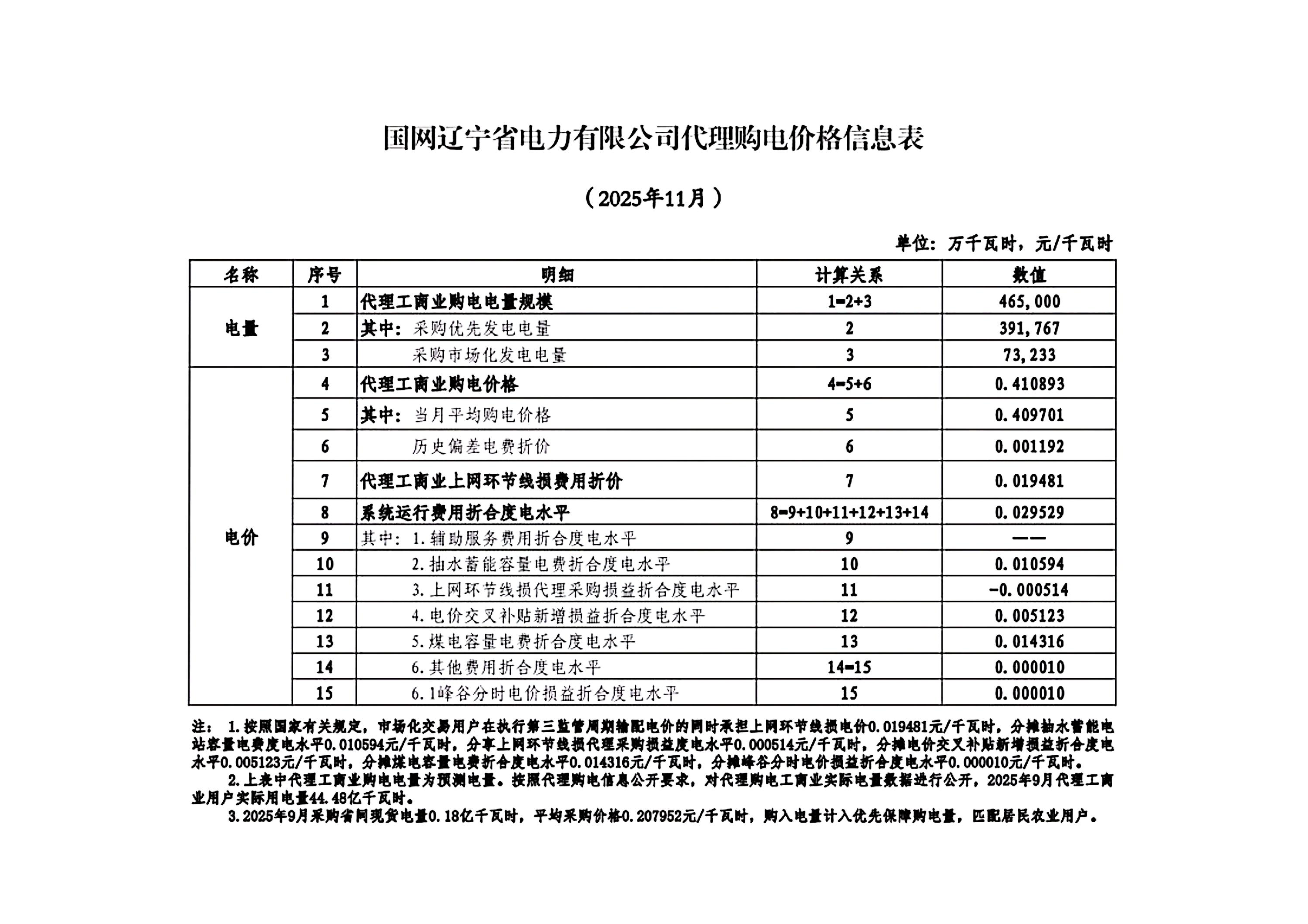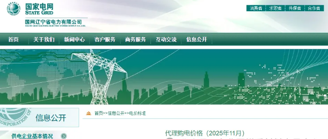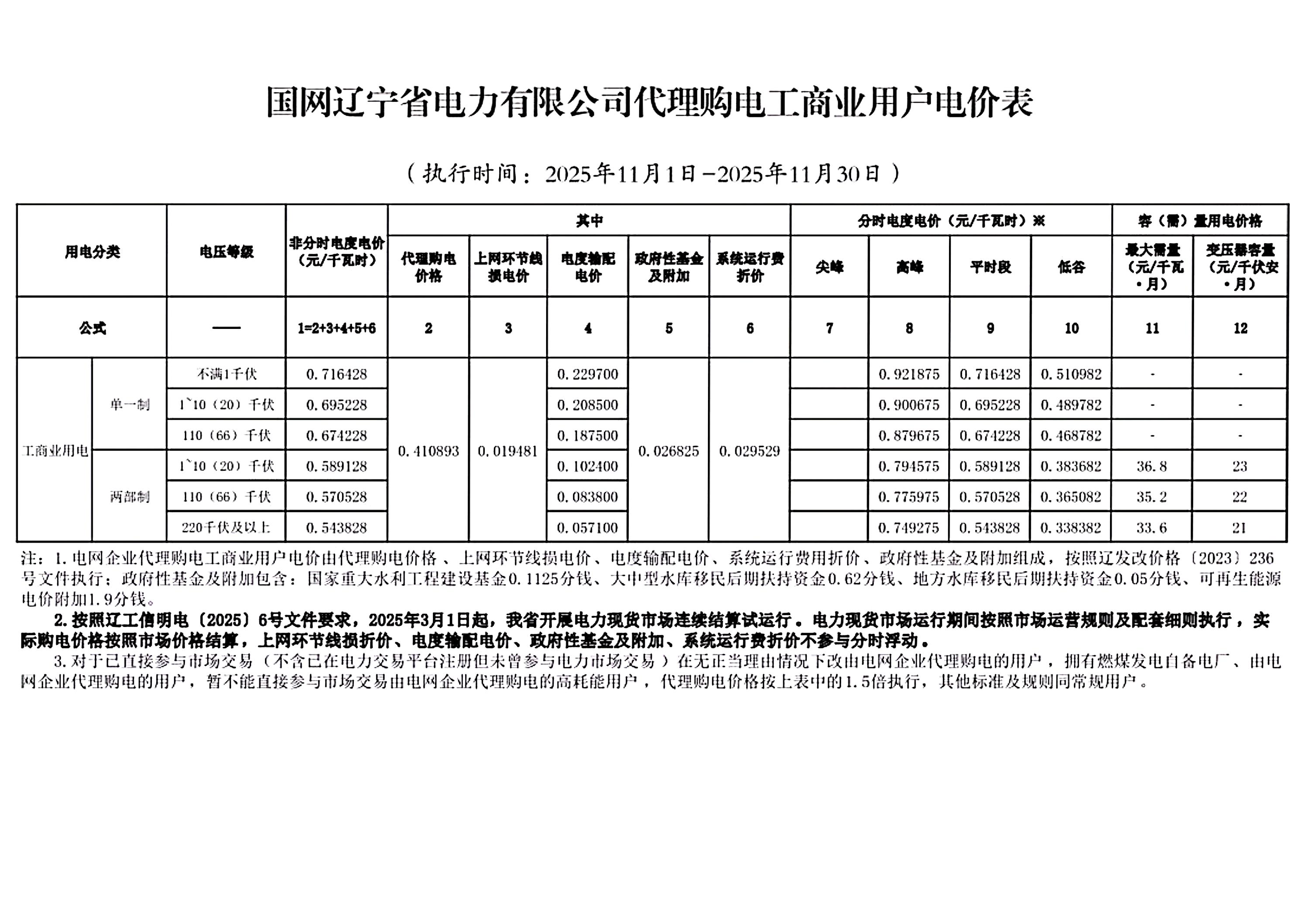 国网辽宁省电力有限公司代理购电工商业用户电价表(2025年11月)