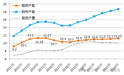 根据WIND,国家统计局公布的粗钢产能在2024年为11.23亿吨(同比增加0.13亿吨),较2018年底增加0.96亿吨,但是还没有达到历史最高值(2014年的11.29亿吨)。