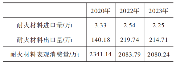 2023年我国耐火材料制品进口量2.25万t,同比减少11.4%;出口量214.71万t,同比减少2.3%;表观消费量2080.24万t,基本与2022年持平,2020—2023年我国耐火材料表观消费量见表2。