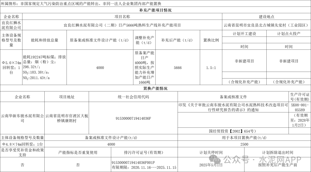 置换方案显示,宜良红狮水泥4000t/d熟料生产线补充产能1666t/d,补充后产能5666t/d,退出产能来自云南华新东骏水泥有限公司4000t/d熟料线(用于本项目2500t/d),置换比例1.5:1。