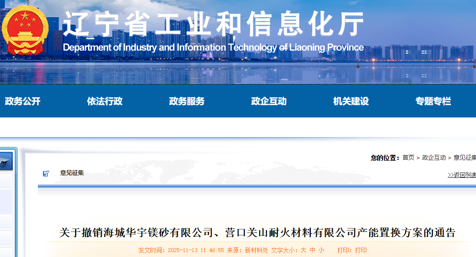 关于撤销海城华宇镁砂有限公司、营口关山耐火材料有限公司产能置换方案的通告2025年6月19日、10月10日,我厅分别对海城华宇镁砂有限公司、营口关山耐火材料有限公司新建轻烧氧化镁项目产能置换方案进行了通告。