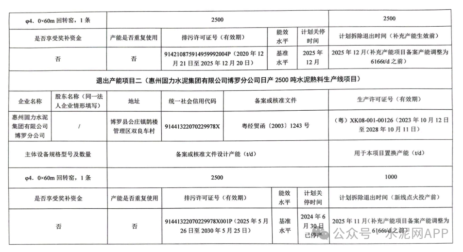 置换方案显示,葛洲坝松滋水泥一条4000t/d熟料生产线补充产能2166t/d,补充后产能6166t/d,退出产能来自同公司一条2500t/d熟料生产线及惠州固力水泥博罗分公司一条2500t/d熟料线(用于本项目1000t/d),前者置换比例1.5:1,后者2:1。