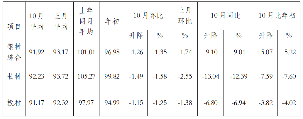 1-10月份,CSPI长材指数平均值为95.12点,同比下降11.10点,降幅为10.45%;板材指数平均值为92.03点,同比下降9.47点,降幅为9.33%。
