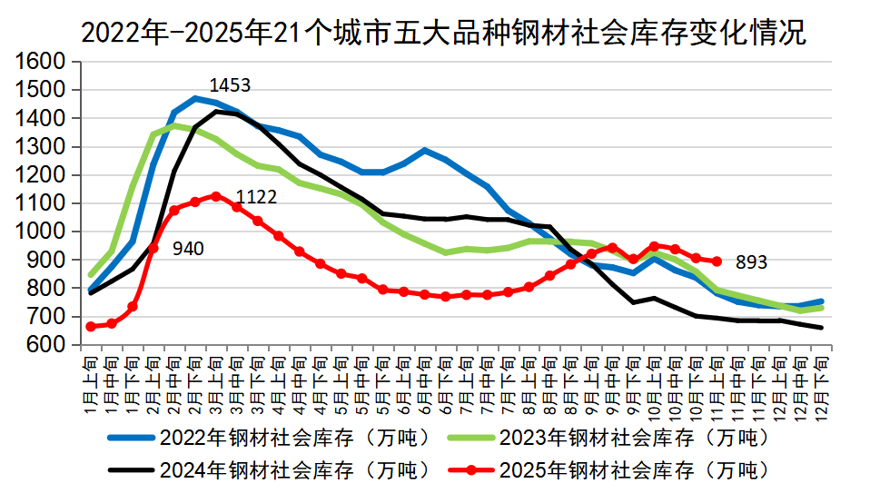 从企业库存来看,11月上旬重点钢企钢材库存位于近三年历史同期高位。2025年11月上旬重点钢铁企业钢材库存量为1549万吨,旬环比增加86万吨,上升5.9%;比上月同旬减少39万吨,下降2.5%;比去年同旬增加183万吨,上升13.4%。