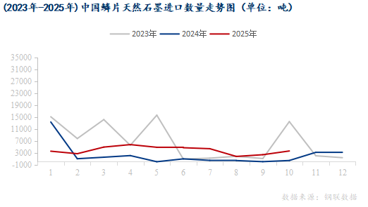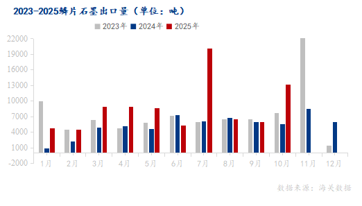 10月天然鳞片石墨出口量环比大幅上涨超过五成,反映了国际市场下游行业为满足生产需求,进行了积极的原料采购。受国际贸易环境不确定性影响,海外客户多持观望态度。虽然在新能源车推动下,负极材料需求增长,但人造石墨负极因技术成熟和低价竞争,削弱了天然鳞片石墨的成本优势。综合来看,预计12月份天然鳞片石墨出口量将面临下行压力。