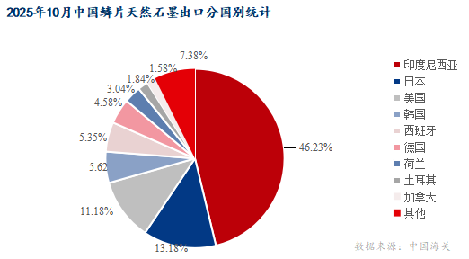 2025年10月天然鳞片石墨出口13150.379吨,其中印度尼西亚出口量最大为6079.900吨,占总比重的46.23%,其次是日本出口量为1733.511吨,占总比重的13.18%,其他贸易伙伴出口量总共占比为7.38%。