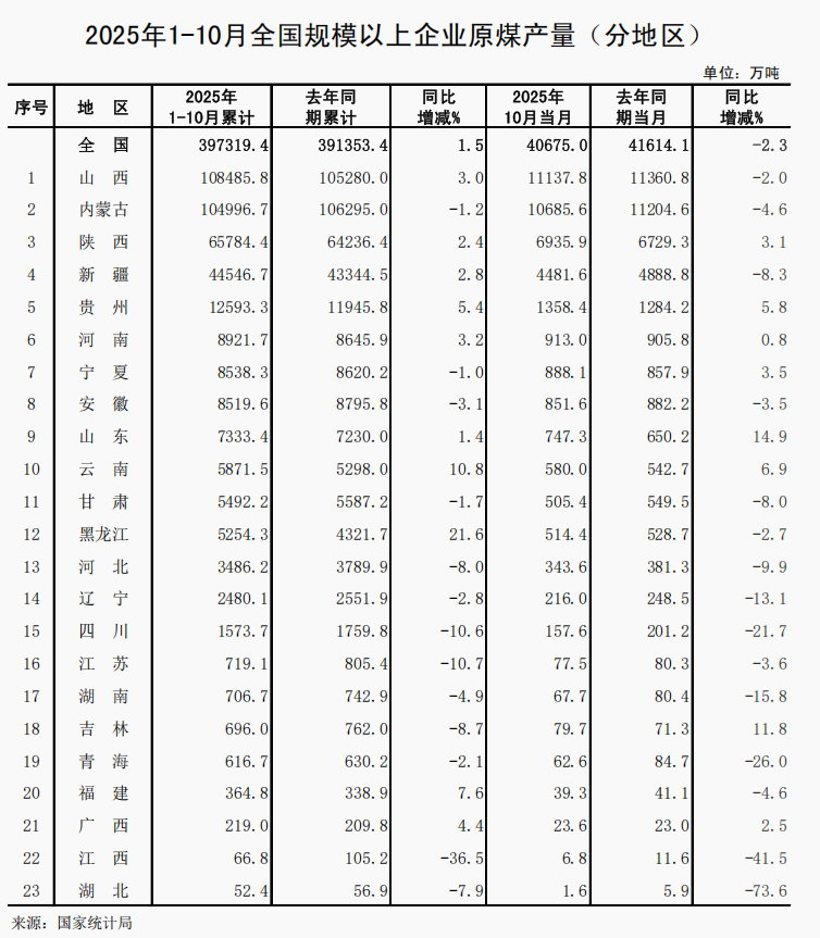 2025年1-10月份全国规模以上分省区原煤产量数据发布