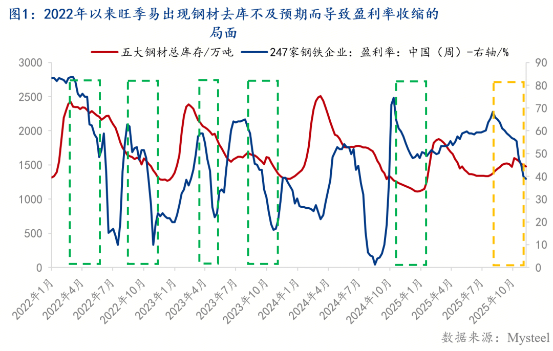 随着金九银十旺季逝去,钢铁行业在需求淡季的拖累之下,钢材去库压力已然显现,因此负反馈逻辑成为当前钢市运行的主要逻辑。结合2022年以来的每年经验来看,钢市负反馈行情易发现在旺季时段(金三银四和金九银十期间);那么导致负反馈行情最根本的原因:我们认为在于旺季钢材去库不及预期(下图1所示)。