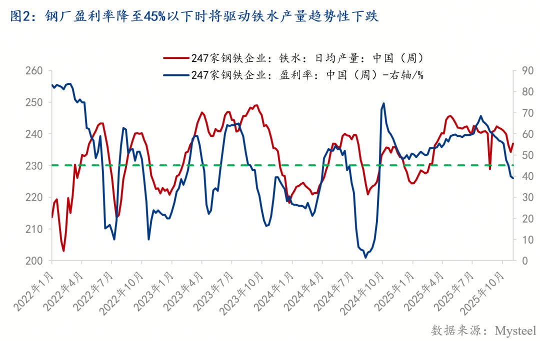 当前钢市运行的核心逻辑是负反馈,根源在于需求淡季下的钢材去库压力,而历史上钢市负反馈行情多发生在“金三银四”及“金九银十”旺季,最根本原因是旺季钢材去库不及预期。历史规律显示,钢材去库拐点通常比钢厂盈利率拐点提前15-30天,核心逻辑是:旺季初期去库乏力矛盾未显现,钢厂盈利仍上升;后期去库乏力引发市场对供应过剩的判断,进而通过打压利润倒逼钢厂减产。钢市负反馈触发的根本条件是旺季钢材库存去化不及预期,而利润水平则是决定钢厂是否减产的直接原因——库存去化不及预期会导致钢厂盈利率下降,降至一定水平后钢厂将通过减产缓解供应压力。2022年以来的历史经验显示,当钢市供过于求、库存去化乏力时,打压钢厂利润倒逼减产是唯一缓解矛盾的途径,且存在明确规律:钢厂盈利率拐点领先铁水拐点约两个月,盈利率降至45%以下铁水产量才会趋势下跌,降至10%-25%中枢水平铁水产量才见底。钢市负反馈的核心目标是通过倒逼钢厂减产,缓解供应过剩导致的钢材库存去化乏力问题,评估减产程度的关键指标为Mysteel247家日均铁水产量(与五大钢材产量存在趋势相关性,且今年以来比值均值约为1.93)。以2022-2023年国庆节后(与今年同期库存高点相当、去库节奏雷同)的去库表现为参考,从去库速率(今年21万吨/周vs两年均值46万吨/周)和去库降幅(今年8%vs两年均值17%)两个维度进行推算,结论便是铁水产量均需从国庆后高点242万吨/日降至200万吨/日左右,才能实现去库节奏趋同;然而当前铁水产量在236万吨/日,理论上仍有36万吨减产空间。理论推算的铁水平衡低点200万吨/日,低于过去四年负反馈行情下的铁水最低值213万吨/日,凸显今年国庆后钢材库存去化动能极度羸弱。但Mysteel排产调研显示,未来铁水低点或在228-230万吨/日,与理论值存在差距,核心原因在于钢厂盈利水平。因此,后续需重点跟踪钢厂盈利变化,这是影响减产落地程度及库存去化进程的关键因素。