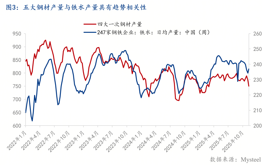 前文论述了钢市负反馈触发的根本条件——即旺季钢材库存去化不及预期,由于钢材库存去化不及预期驱动,钢厂盈利率发生下降,当盈利率下降至一定水平后,钢厂便会开启减产以此缓解供应压力,因此可以说利润水平是决定钢厂是否减产的直接原因。从2022年以来的四年历史经验来看,每当钢铁市场出现供过于求库存去化发力的矛盾时,负反馈开启通过打压钢厂利润倒逼其减产便成为了唯一缓解矛盾的途径。如下图2所示,首先从时间维度来看,减产过程中,钢厂盈利率拐点一般领先铁水拐点两个月左右;其次,每当钢厂盈利率降至45%以下的水平时,铁水产量才会开启趋势下跌。参考过去四年当中的数次负反馈行情,只有当钢厂盈利率降至10%-25%的中枢水平时,铁水产量才会出现见底,因此从当前情况来看,铁水产量或远未见底。