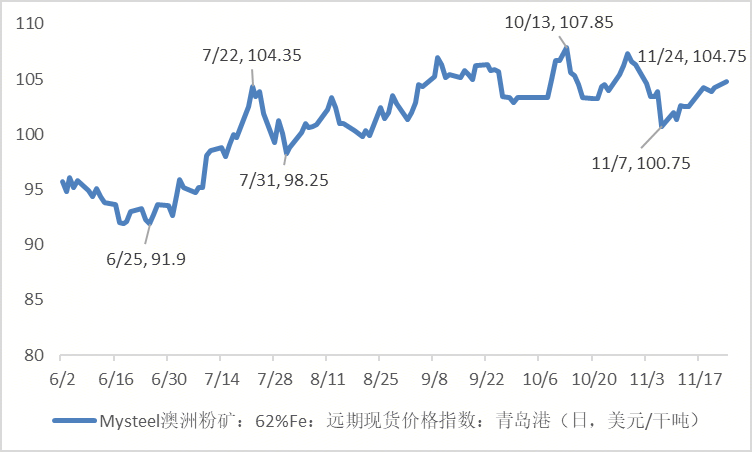 近期市场关注铁矿石价格上涨。单从近两周的表现来看, Mysteel铁矿石62%价格指数自11月7日的阶段性低点100.75美元/吨上涨至11月24日的104.75美元/吨,上涨4美元/吨,涨幅3.97%。
