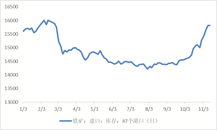 综合影响47港进口矿库存连续7周攀升至11月14日的15813万吨,较国庆节前增加1262万吨。