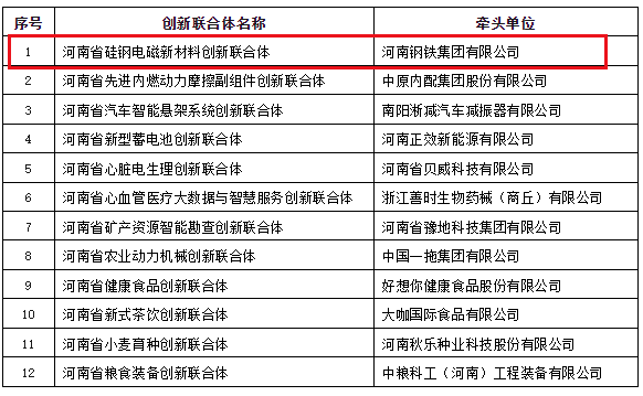 河南省科技厅近日公示,拟组建12家河南省创新联合体,包括河南钢铁集团牵头的河南省硅钢电磁新材料创新联合体等。