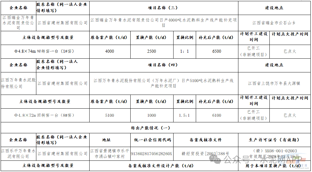 公示内容显示,江西省建材集团有限公司拟将下属成员企业江西乐平万年青水泥有限公司1#窑2500t/d水泥熟料产能,用于江西乐平万年青水泥有限公司、江西玉山万年青水泥有限公司两家企业2条水泥熟料生产线进行补充产能,置换比例分别为1︰1和1.5︰1,分别补充江西乐平万年青水泥有限公司2#窑700t/d水泥熟料产能、江西玉山万年青水泥有限公司1#窑1200t/d水泥熟料产能;