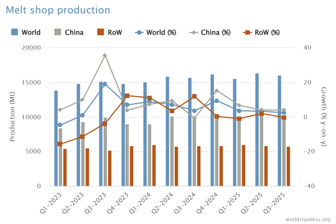 世界钢铁协会下属不锈钢分会发布的2025年第三季度的数据表明,前九个月全球不锈钢粗钢产量为4800万吨,同比提高3.0%。
