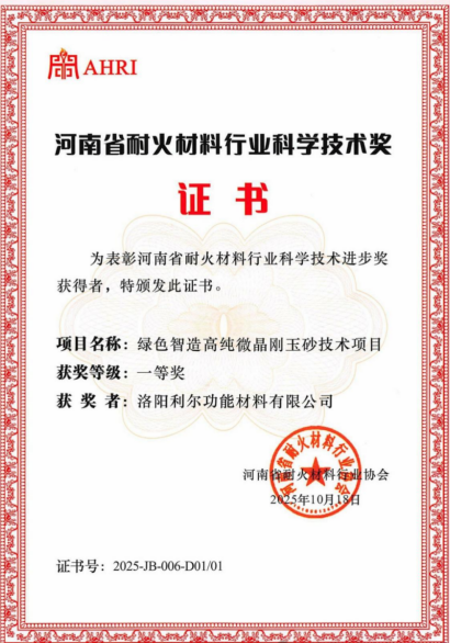 近日,2025年度河南省耐火材料行业科学技术奖评选结果揭晓,洛阳利尔功能材料有限公司申报的“绿色智造高纯微晶刚玉砂技术项目”脱颖而出,荣获科学技术进步奖一等奖,标志着该公司在高端耐火材料绿色制造与智能化生产领域取得重大突破。