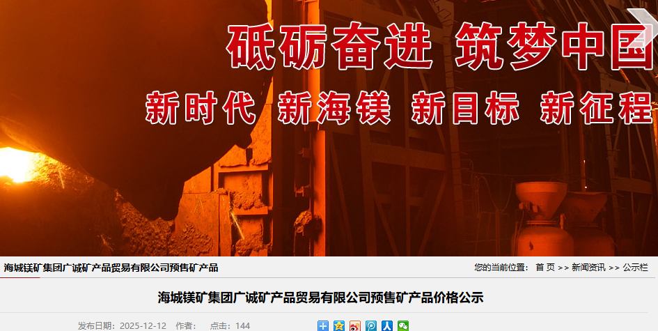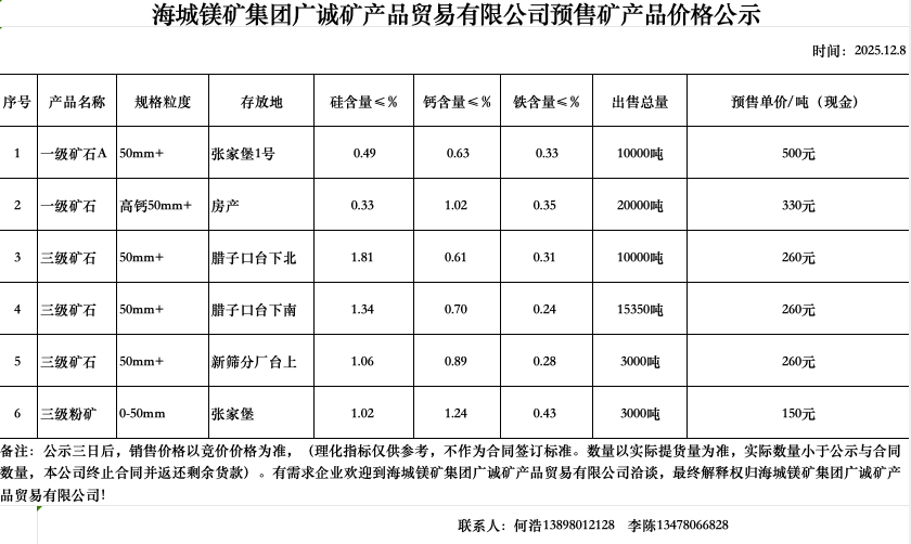 海城镁矿集团广诚矿产品贸易有限公司预售矿产品价格公示
