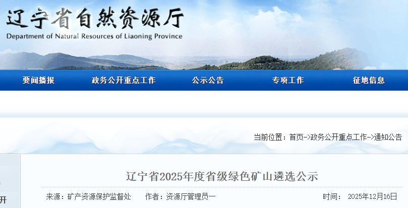 按照《关于进一步加强辽宁省绿色矿山建设的通知(辽自然资规〔2025〕4号)》中关于省级绿色矿山遴选工作的相关要求,全省现有19家矿山企业通过了市级第三方评估、部门联审、实地核查等程序已达到了遴选标准,依据遴选程序向社会公示5个工作日,公示期内如有异议,举报人需实名通过电话或来访等形式向我厅反映。