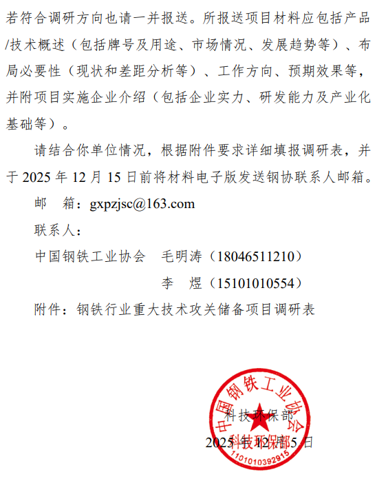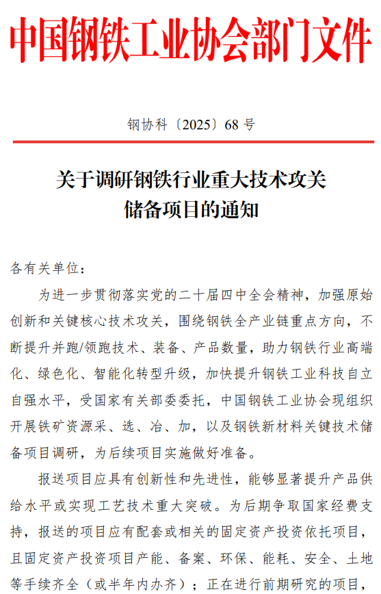 关于调研钢铁行业重大技术攻关储备项目的通知
