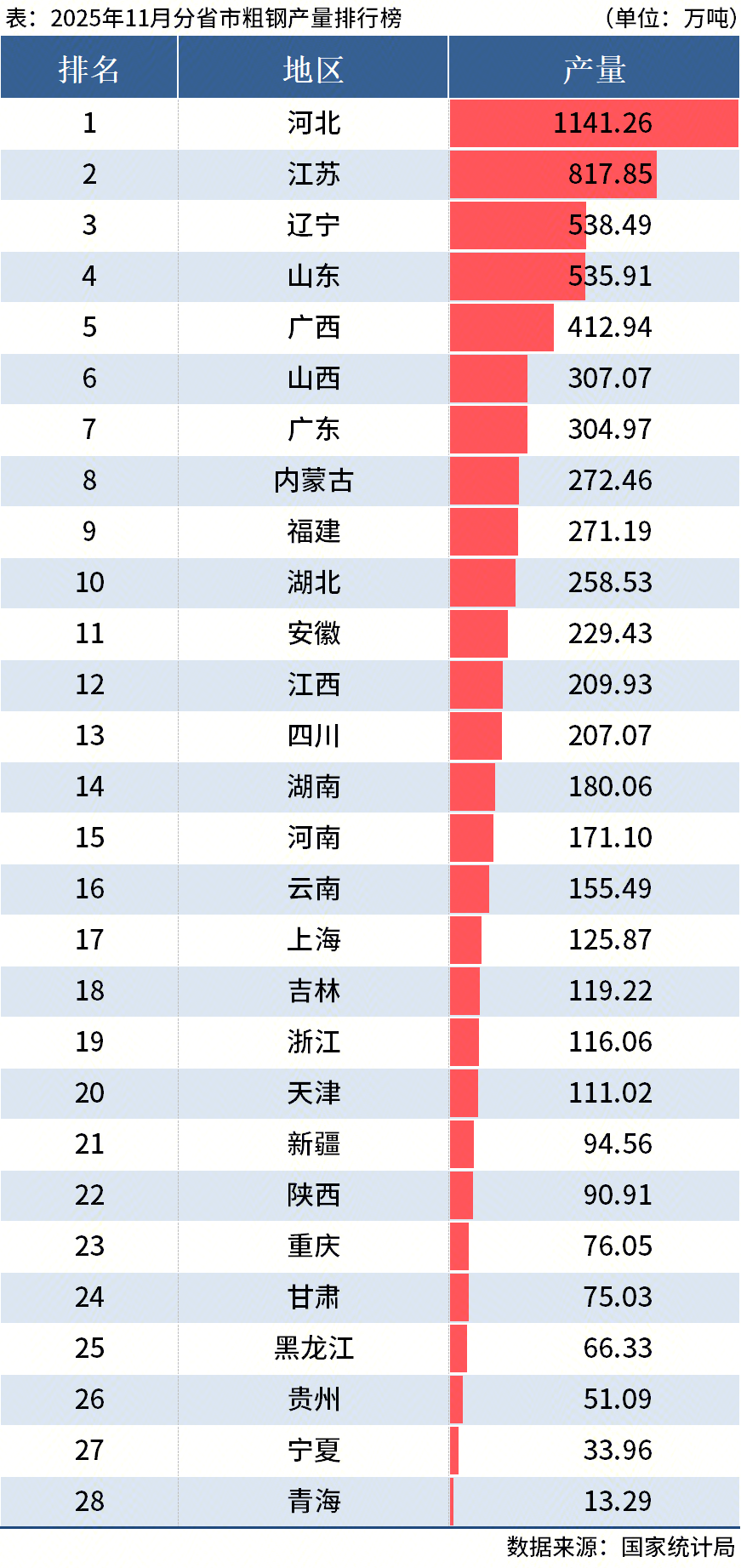 国家统计局数据显示,2025年11月中国粗钢产量6987.1 万吨,同比下降10.9%;1-11月累计粗钢产量89166.5 万吨,同比下降4.0%。