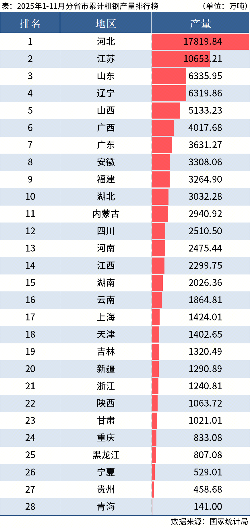 从分省市数据来看,2025年1-11月河北以产量17819.84万吨位列第一;江苏产量10653.21万吨排在第二;山东产量6335.95万吨排在第三。