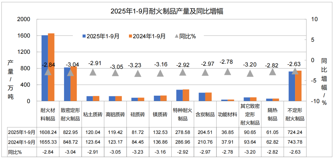 1-9月,协会同口径统计,全国耐火材料制品产量1608.24万吨,同比降低2.84%。其中致密定形耐火制品822.95万吨,同比降低3.04%;保温隔热耐火制品61.05万吨,同比降低2.82%;不定形耐火制品724.21万吨,同比降低2.63%,主要品种产量见图1。