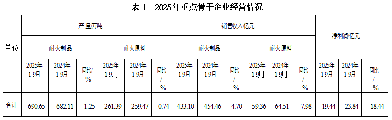 协会通过对113家重点耐火材料企业2025年1-9月经营情况调研显示,耐火材料产量952.04万吨(含部分耐火原料),同比增长1.11%;113家企业耐火制品产量690.65 万吨,同比增长1.25 %。耐火材料销售总收入492.46亿元,同比降低5.11 %;剔除原料,其中耐火制品销售总收入433.10亿元,同比降低4.70%。113家企业实现利润19.44 亿元,同比下降18.44%,销售利润率约3.95%;上缴税金25.50亿元,同比下降4.00%。表1列出了上述调查情况。