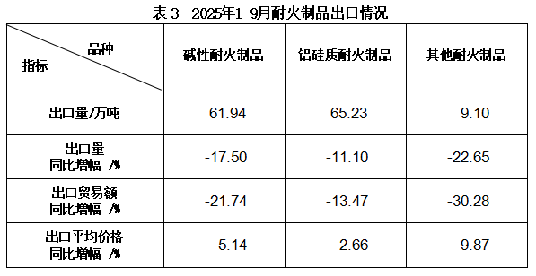 1-9月,全国耐火原材料进出口贸易总额25.76亿美元,比上年同期降低13.65%。其中出口贸易额24.28亿美元,同比降低15.06%;进口贸易额1.48 亿美元,同比增长18.57%;全国耐火原材料出口总量495.86万吨,同比降低 8.21%。其中耐火原料出口量359.59万吨,同比降低5.37%;耐火制品出口量136.27万吨,同比降低14.95%。相较2024年同期,原料和制品的出口量和出口平均价格都有不同程度的降低。