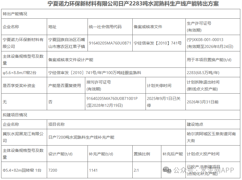 置换方案显示,宁夏诺力环保新材料退出2283t/d产能,用于补充冀东水泥黑龙江公司一条7200t/d熟料生产线,补齐后产能为8341t/d,置换比例2:1。