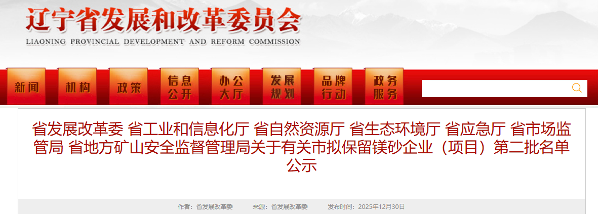 根据《辽宁省人民政府办公厅关于推进菱镁行业高质量发展的实施意见》(辽政办发〔2023〕15号)、《辽宁省人民政府办公厅关于印发辽宁省菱镁行业专项整治方案的通知》(辽政办发〔2023〕34号)要求,有关市政府向省菱镁行业高质量发展领导小组办公室报送了本市拟保留镁砂企业(项目)名单,现将相关企业(项目)名单有关情况面向社会公示,公示期5个工作日。