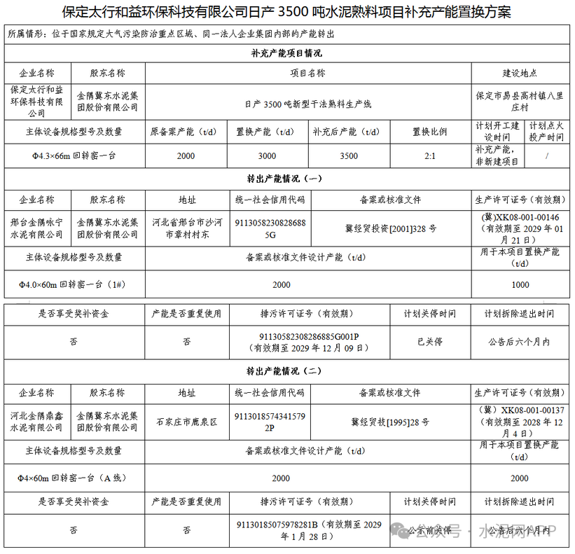 保定太行和益环保科技公司一条2000t/d熟料生产线补充产能1500t/d,补齐后产能3500t/d,退出产能来自邢台金隅咏宁水泥一条2000t/d熟料线(其中1000t/d用于本项目)、金隅鼎鑫水泥一条2000t/d熟料线,置换比例2:1。