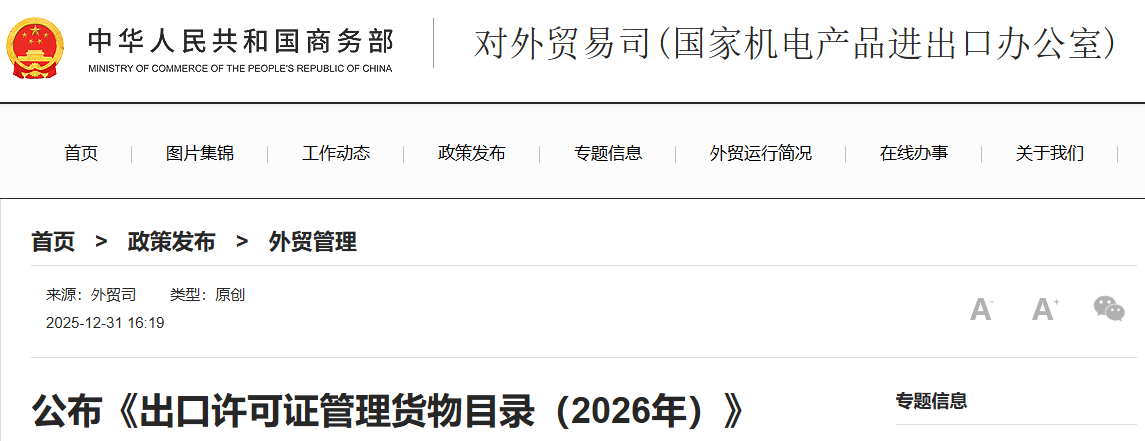 依据《中华人民共和国对外贸易法》《中华人民共和国货物进出口管理条例》《消耗臭氧层物质管理条例》《货物出口许可证管理办法》《消耗臭氧层物质进出口管理办法》等法律、行政法规和规章,现公布《出口许可证管理货物目录(2026年)》(以下简称为目录)和有关事项。