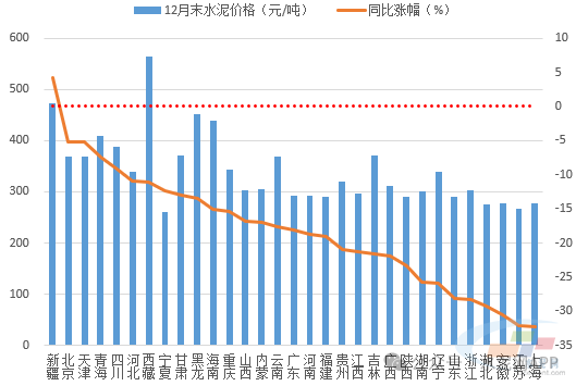 截至12月底,全国水泥价格指数录得102.75点,同比降幅超20%。