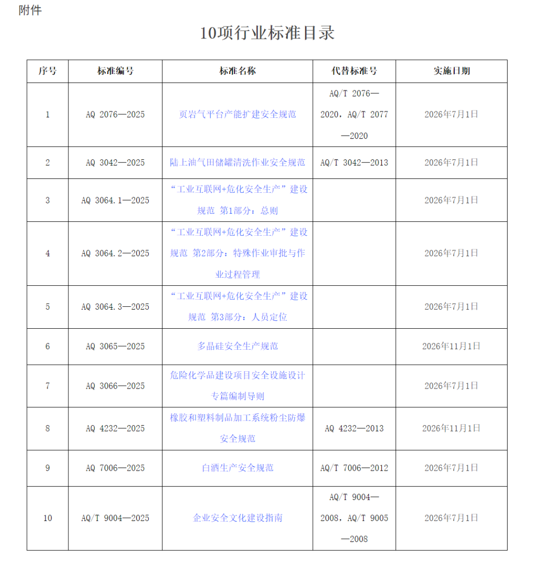 中华人民共和国应急管理部批准《页岩气平台产能扩建安全规范》等10项行业标准(标准文本附后),现予公布。